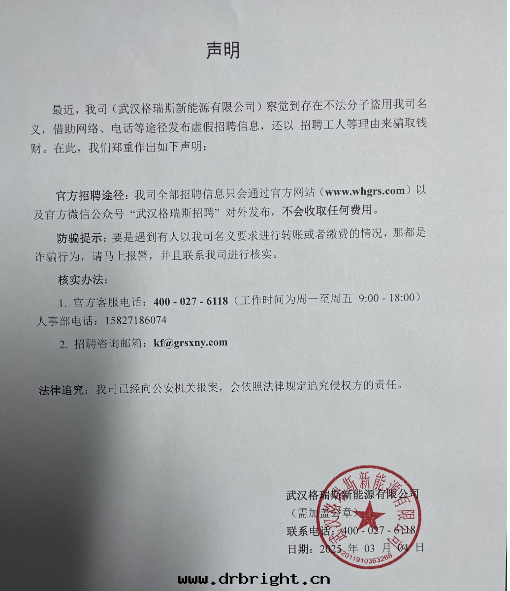 最(zuì)近(jìn),我(wǒ)司(武漢格瑞斯新(xīn)能(néng)源有限公(gōng)司)察覺到(dào)存在(zài)不(bù)法(fǎ)分(fēn)子盜用(yòng)我(wǒ)司名(míng)義,借助网(wǎng)絡、電(diàn)話(huà)等途徑發(fà)布(bù)虛假招聘信(xìn)息,還(huán)以 招聘工人(rén)等理(lǐ)由(yóu)来(lái)騙取(qǔ)錢(qián)财。在(zài)此(cǐ),我(wǒ)们郑重作出(chū)如(rú)下聲明(míng):